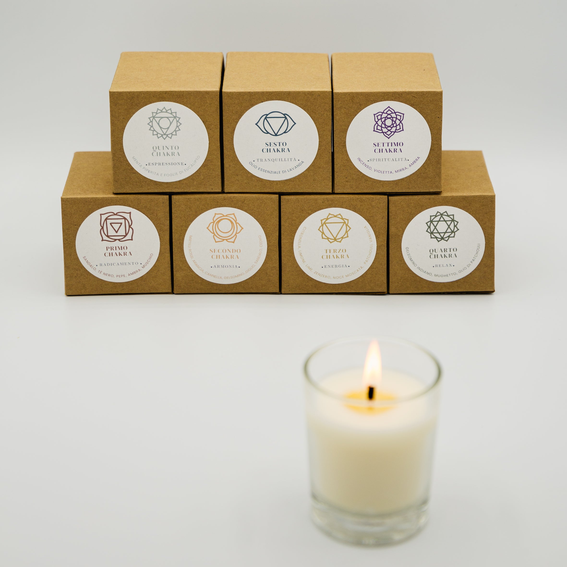 Set di candele 7 chakra, concepite per favorire la meditazione e bilanciare i chakra attraverso l’aromaterapia.