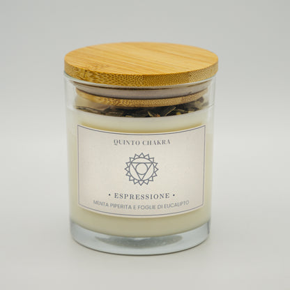 Candela 7 chakra Quinto Chakra con aroma di menta piperita e foglie di eucalipto